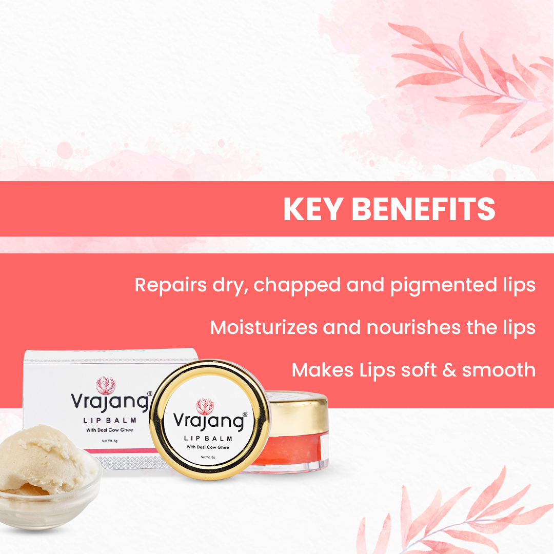 Enriched with the goodness of exotic mango butter along with the nourishing action of cow ghee Vrajang Lip Balm repairs damaged, dry, and pigmented lips overnight. Get soft and supple lips with this buttery goodness.