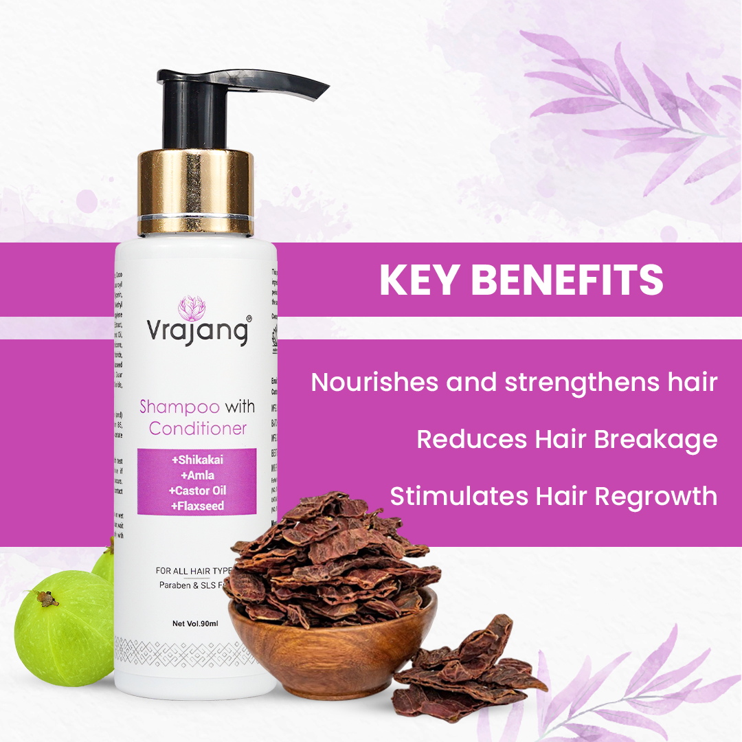 Vrajang Shampoo with Conditioner is the best, it is gentle on your hair and leaves it feeling soft and shiny. It is formulated with natural ingredients like shikakai, flax seeds, and castor to work well with all types of hair, whether you have straight, curly, or frizzy hair. The shampoo gently removes dirt and oil, while the conditioner adds moisture and helps to repair the damage.